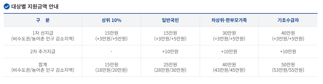 비수도권(서울·인천·경기 제외) 거주자는 3만원, 인구감소지역은 5만 원이 추가 지급됩니다.
